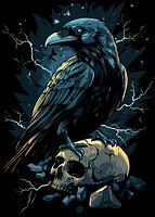 Een sinistere raaf zit op een menselijke schedel, omringd door gekartelde rotsen en bliksem. De dramatische belichting en de donkere lucht benadrukken de onheilspellende sfeer. Een schril contrast tussen leven, dood en natuurkrachten.