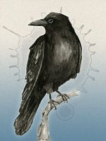 De achtergrond is een warme papier structuur met een lichte grote vlek die als een soort halo om de raaf heen staat. De kleur verloopt naar beneden toe in een koele blauwe tint.