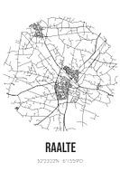 Zwart-witte landkaart, stratenplan of plattegrond van Raalte. Raalte is gelegen in de gemeente Raalte, provincie Overijssel. Op de stadskaart zijn alle openbare wegen in Raalte opgenomen. Verder is de kaart voorzien van de coördinaten van het centrum van Raalte.