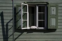 Het is niet meer dan een raam en een stuk van de muur van een huis in Haarpalu. Helemaal aan de noordkust van Estland. een mengeling van verschillende tinten groen en de contrasterende tegenstelling van het wit van de kozijnen en de schaduw op de muur. Een romantisch noordelijk beeld met de dubbele ramen en de luiken die als het koud en donker en winter is ook nog dicht tkunnen om extra geborgenheid te geven. Maar nu is het zomer, zijn de dagen lang en is er alle gelegenheid om de ramen open te zetten, de frisse lucht binnen te laten en het beddegoed te luchten. Dat geeft het geheel ook een vriendelijker aanzicht. Er gebeurt iets gewoons, iets dagelijks.
