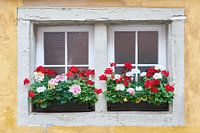 Raam van een middeleeuws huis in het historische centrum van Rothenburg ob der Tauber in Duitsland met enkele bloeiende geraniums op de vensterbank