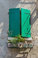 Raam met groene luiken en wat planten in de romantische oude stad Malcesine aan het Gardameer in Italië. Malcesine is een populaire bestemming voor toeristen van over de hele wereld. Hoewel de stad aan het Gardameer in Noord-Italië ligt, heeft het meer een mediterrane sfeer.