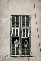 Dit raam met mooie verweerde louvre deurtjes heb ik gefotografeerd in Frankrijk.