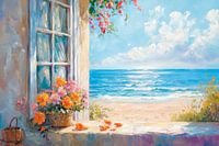 Een vleugje mediterrane idylle zweeft rond de open vensterbank, waar bloeiende bloemen zachtjes wuiven in de warme wind. De glinsterende oceaan strekt zich majestueus uit terwijl de wolken zachtjes langs de hemel drijven. Deze foto nodigt je uit om het leven van alledag achter je te laten en je onder te dompelen in de rust van de zee.