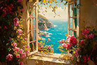Een weelderige bloemenzee omlijst het open raam, waardoor het uitzicht valt op een glinsterende, azuurblauwe zee. Zachte golven dansen in het licht, terwijl de gouden zonnestralen het kustlandschap omarmen. Er hangt een vleugje vakantieromantiek in de lucht en de geur van de bloeiende planten verleidt de zintuigen tot dromerige gedachten.