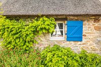 Raam van een oud huis met rieten dak op het Ile-aux-Moines in de Golf van Morbihan, Morbihan, Bretagne, Frankrijk