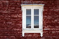 Terwijl ik langs de huizen op Varanger liep, zag ik bij dit huis dat het landschap werd weerspiegeld in het oude raam.