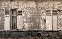 Vervallen muur met twee ramen met open en dicht luik in off white. Mogelijkheid voor een drieluik.
