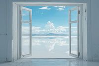 Geniet van het rustige uitzicht op een uitgestrekt zoutmeer door een open raam. Deze minimalistische poster brengt de heldere en verfrissende sfeer van de natuur in je woonkamer. Ideaal voor liefhebbers van minimalistische kunst en iedereen die een rustige en vredige omgeving wil creëren. De koele kleuren en het weidse landschap maken het een perfect decoratiestuk.