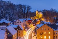 Kasteel Rabenstein in de gelijknamige wijk Chemnitz op het blauwe uur in de winter.