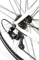 Racefiets detail derailleur tandwielen in wit met zwarte en grijze details op een witte achtergrond in de studio. De moderne fiets is voorzien van minimalistische spaakwielen en zwarte details