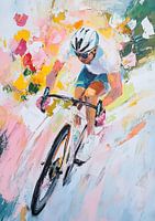 Abstract schilderij van een elegante fietser op haar fiets, met witte en pastelkleuren in een impressionistische stijl. De achtergrond is lichtroze en de fietser draagt een witte helm, een blauwe korte broek en een geel shirt. De belichting is dramatisch, met stralen zonlicht en bloemen die waaien in de wind. De compositie is dynamisch en mooi en creëert een elegante en prachtige scène.