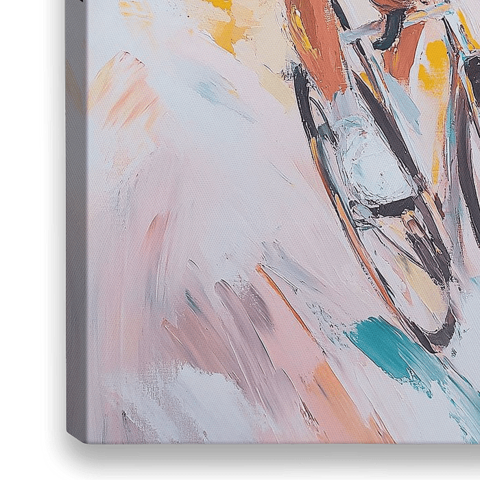 Hij heeft zich toegelegd op de race en elk detail van zijn rit vastgelegd in een impressionistische stijl met pastelkleuren en expressieve penseelstreken. De fietser draagt een witte helm en een lichtblauwe trui terwijl hij op een racefiets door het zonnige landschap scheurt. In vooraanzicht met nadruk op gezichtsuitdrukking en…
