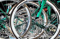 Een voorraadje racefietswielen en racefietsen als reservemateriaal op het dak van een volgauto in de wielerkoers....(de foto is bewerkt om een stoer grafisch effect te bereiken...)