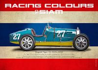 Illustratie van een serie racewagens in nationale racekleuren uit de hele wereld.