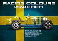 Illustratie van een serie racewagens in nationale racekleuren uit de hele wereld.