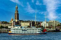Raderstoomboot op de Elbe in de haven van Hamburg met aanlegsteigers en Michel