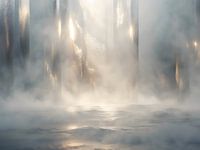Goud en zacht blauw lossen op in een uitgestrekte, mistige ruimte waarin grenzen vervagen. Verticale lichtsluiers stijgen op uit een dampige ondergrond, terwijl warme reflecties subtiel door nevel en schaduw heen breken. Er is geen centraal object, geen…