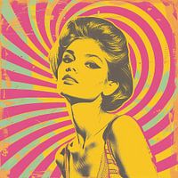 Monochrome retro riso print van een mooie vrouw in een jurk, met een gele en felroze achtergrond in een wervelende vintage stijl. Deze poster combineert tijdloze charme met levendige kleuren en een opvallend design, waardoor het een perfecte keuze is voor een unieke en speelse wanddecoratie. De elegante vorm van de vrouw en de…