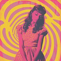 Monochrome retro riso print van een mooie vrouw in een jurk, met een gele en felroze achtergrond in een wervelende vintage stijl. Deze poster combineert tijdloze charme met levendige kleuren en een opvallend design, waardoor het een perfecte keuze is voor een unieke en speelse wanddecoratie. De elegante vorm van de vrouw en de dynamische achtergrond creëren samen een boeiend kunstwerk dat zowel stijlvol als opvallend is.