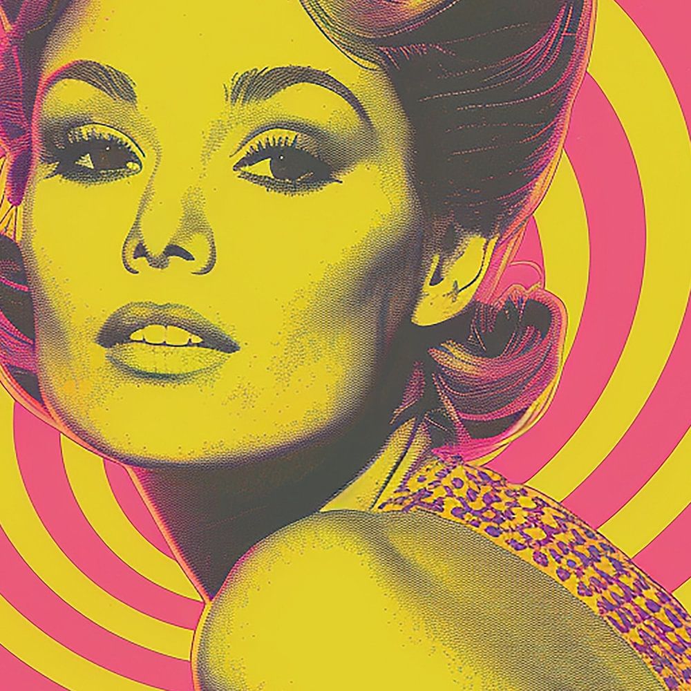 Monochrome retro riso print van een mooie vrouw in een jurk, met een gele en felroze achtergrond in een wervelende vintage stijl. Deze poster combineert tijdloze charme met levendige kleuren en een opvallend design, waardoor het een perfecte keuze is voor een unieke en speelse wanddecoratie. De elegante vorm van de vrouw en de dynamische achtergrond creëren samen een boeiend kunstwerk dat zowel stijlvol als opvallend is.