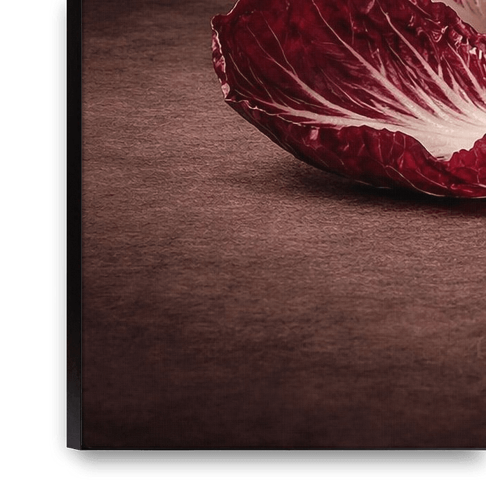 Een verfijnd botanisch stilleven van radicchio in klassieke fine art-stijl. De staande compositie benadrukt de sculpturale vorm van de kroppen, terwijl het doorgesneden exemplaar de elegante binnenstructuur van roomwitte nerven en diepe bordeauxrode bladeren onthult. Tegen de donkere matte achtergrond krijgt het geheel een rustige,…