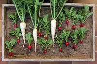 Radijsjes en radijsjes liggen op het houten dienblad