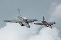 Het Rafale Solo Display Team 2018 van de Franse Luchtmacht. Rechts de Rafale die de shows vliegt en links een tweezits toestel met aan boord de coach van het team.