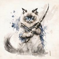 Aquarel portret van een stoere Samoerai Ragdoll kat met een dubbelzijdig katana zwaard.