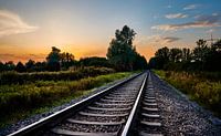 Sporen leiden door een landelijk gebied met velden en bomen bij zonsondergang. Rastatt, Duitsland.