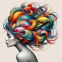 Een met behulp van AI (Artificial Intelligence) vervaardigd fantasieportret van een kleurrijke zeemeermin, op een lichte achtergrond.
