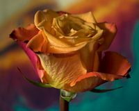 Altijd leuk om foto's te maken uit een gekregen boeket. Dit maal kwam zoonlief met een pachtige bos aanzetten. Deze macro foto van een oranje roos heb ik gefotografeerd tegen een regenboogkleurige achtergrond.