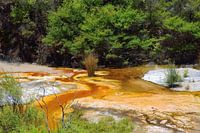 We hielden van de kleurrijke Rainbow Terrace details in het geothermische gebied van Orakei Korako in de buurt van de stad Mihi, Nieuw-Zeeland. Dit terras maakt deel uit van het laagste terras in Orakei Korako, het jadegroene Emerald Terrace dat het grootste in zijn soort is in Nieuw-Zeeland. Een van de borden gaf aan dat er "bijna 20…