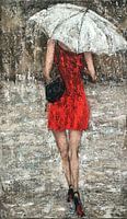 Een vrouw licht geklede met een rode jurk loopt in de straat met een paraplu. In dit hedendaagse schilderij kunnen we genieten van een erg mooie contrast tussen de bruin en grijze omgeving en de lady in red. De ruwe achter grond versterkt het werk.