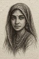 Dit draadportret toont een jonge vrouw uit Rajasthan, India, gehuld in een traditionele sluier, een ghoonghat. Haar blik is kalm en indringend tegelijk, en haar ogen spreken meer dan woorden. De subtiele bindi op haar voorhoofd en de fijne details in haar sieraden verraden trots en cultuur.