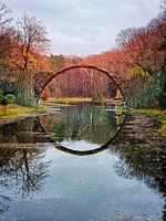 De Rakotzbrug met weerspiegeling in het Rakotzmeer bij Kromlau in Saksen, Duitsland. De reflectie in het water creëert het beeld van een bijna perfecte cirkel. Dit is mogelijk de reden waarom deze brug de Duivelsbrug wordt genoemd. De boogbrug met een overspanning van bijna 20 meter werd gebouwd tussen 1866 en 1875. De brug diende als interessante en mystieke filmset in de film "Matrix Resurrections" uit 2021 en de film "The Sorcerer's Apprentice" uit 2017.
