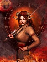 Ram - uit mijn Fantasy Zodiac serie. Haar element is vuur, vertegenwoordigd door vlammen, rook en vonken. Haar planeet is Mars, te zien in de linkerbovenhoek.