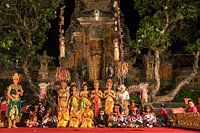 Gekostumeerde dansers die het klassieke Ramayana Ballet uitvoeren in Ubud Palace / Puri Saren Agung in Ubud, Bali, Indonesië | Bali-danser die het klassieke Ramayana Ballet uitvoert,Ubud Palace / Puri Saren Agung, Ubud, Bali, Indonesië
