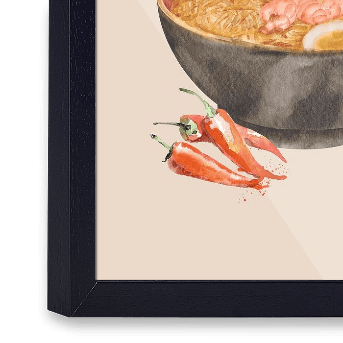 Laat de heerlijke geur van versgemaakte ramen je huis vullen met deze levendige aquarel! De dampende kom staat centraal in deze kunstzinnige weergave van een Japans favoriet. De rijke, warme kleuren van de bouillon en de glanzende noedels nodigen uit tot een hap. De verse garnalen en het zachte ei zijn met zorg geschilderd, waardoor je…