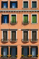 Traditionele symmetrische Italiaanse ramen, luiken en balkons in diverse kleuren. Gezien in het centrum van de stad Venetië op een zonnige zomerse dag.