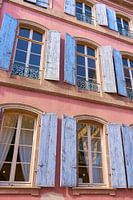 Raam met luiken aan de gevel van een historisch huis in de historische oude stad Colmar in Frankrijk. De oude stad Colmar, met zijn vele liefdevol gerestaureerde en bewaarde historische kleurrijke gebouwen, lijkt voor veel bezoekers op het decor van een sprookjesfilm. En toch is alles hier echt.