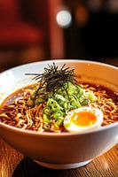 Een dampend genot in een fijne kom - de felle kleuren van de verse ingrediënten wekken meteen de verwachting van culinaire avonturen. Malse ramen noedels omringd door een perfect zachtgekookt ei, gegarneerd met knapperige bieslook en nori. Dit smakelijke kunstwerk brengt leven in elke keuken en fleurt elke eettafel op.