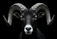 Close-up van een zwarte ram met gebogen horens die naar voren kijkt tegen een zwarte achtergrond. De ogen zijn prominent aanwezig.