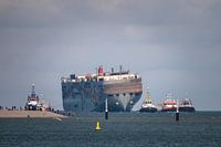 Aankomst van de uitgebrande autoboot Fremantle Highway in de Eemshaven.