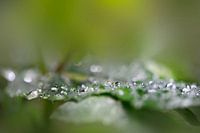 Macrophotographie de gouttes de rosée sur feuilles.