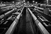 Station Groningen met daarachter het rangeer terrein waar vele treinstellen staan te wachten om passagiers te vervoeren.