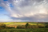 Het Zuid-Limburgse heuvelland met het gehucht Elekenrade bij ondergaande zon gezien vanaf Fromberg (Nederland). Let op de aparte wolkenformaties boven het Ransdalerveld.