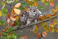 Twee Ransuilen in een kleurrijke boom in de herfst. De Ransuil is een relatief grote uil, die voorkomt in heel Europa, met uitzondering van IJsland. Net als de meeste uilen is ook de Ransuil vooral actief als het donker is. Deze uil jaagt op knaagdieren en rustende vogels. De Ransuil komt voor in bosachtige gebieden met naaldbomen en open terreinen. In de winter verblijven Ransuilen graag in elkaars gezelschap.