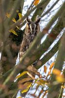 Deze ransuil trof ik in een boom waar nog kleurige herfstblaadjes aan de takken zaten. Hij was al vroeg aan het roesten en bleef erg alert en me aankijken. Ransuilen zoeken doorgaans elkaars gezelschap op als het kouder wordt: ze groeperen zich om overdag gezellig samen in een boom een uiltje te knappen. Dat unieke gedrag heet 'roesten'. Ransuilen behoren tot de weinige uilensoorten die samenleven met soortgenoten.