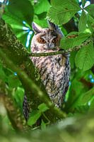 Ransuil  in en kastanjeboom/ Long-eared owl in a chestnut tree van Henk de Boer